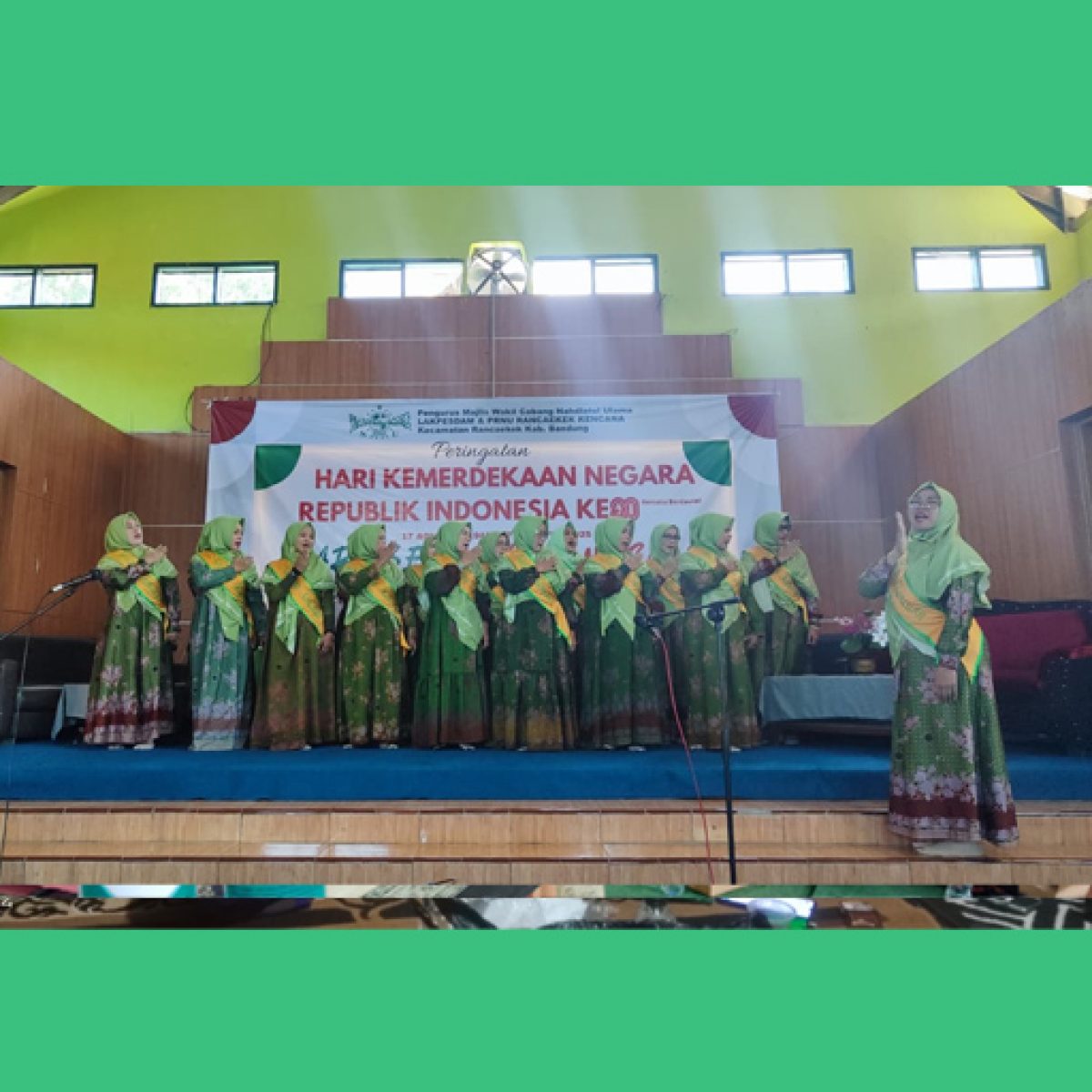 Sebagai tanda cinta tanah air, acara dilanjutkan dengan menyanyikan lagu kebangsaan Indonesia Raya dan Ya Lailal Wathon yang dinyanyikan oleh Paduan Suara ibu-ibu Muslimat Ranting Kencana, yang membuat seluruh peserta larut dalam semangat nasionalisme.